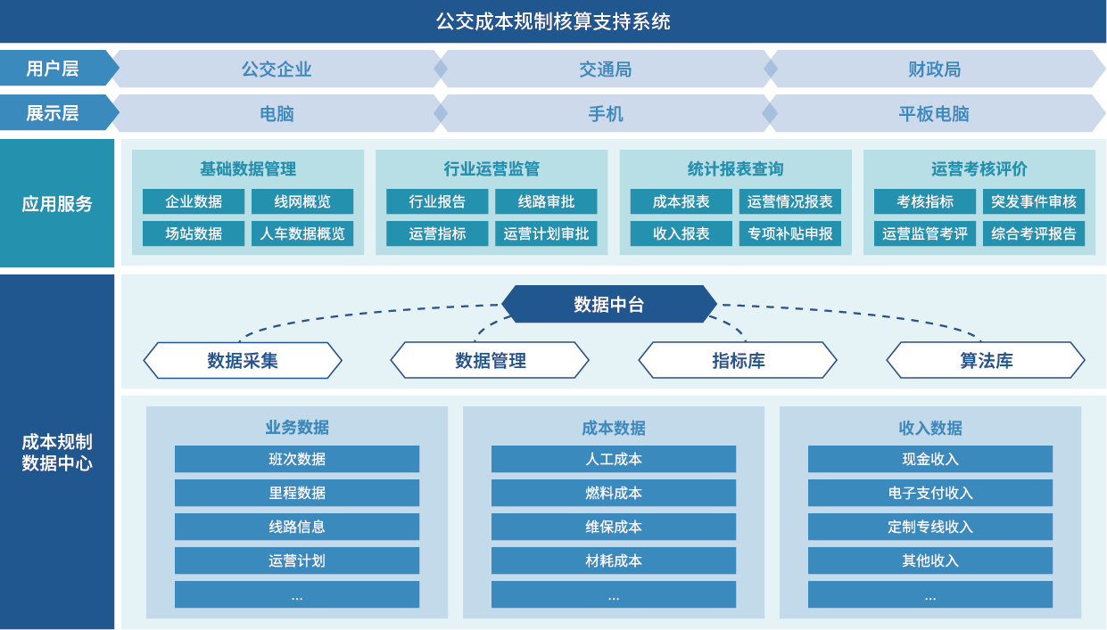 公交成本規制核算支持系統,是輔助政府核算應承擔公交財政補貼數額的應用系統。系統對政府規制的公交企業(yè)成本與營(yíng)收進(jìn)行分類(lèi)匯總,并建立城市公交單位運輸成本與運營(yíng)考核評價(jià)體系,以此測算財政補貼數額和評價(jià)公交企業(yè)經(jīng)營(yíng)狀況。以促進(jìn)公交企業(yè)進(jìn)行成本控制、規范營(yíng)收,約束不合理的公交成本增加和投入,保證在規定的財政補貼下公交企業(yè)能夠可持續發(fā)展。